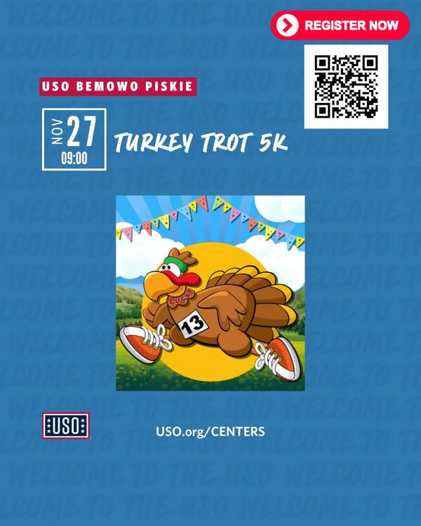 Join us for the USO Turkey Trot 5K on Saturday, November 27, 2025! The race kicks off at 09:00 sharp at the BPTA USO Center, with check-in starting at 07:00. All finishers earn bragging rights, and top runners will receive awards, with recognition for runners-up too. Enjoy snacks, refreshments, and post-race photos displayed in the USO Center. This fun run is open to all coalition service members—move at your own pace. Have questions? Contact the USO team anytime.
